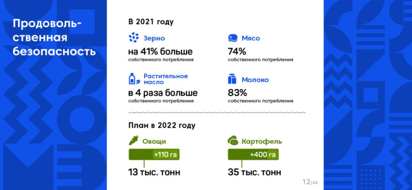 Наиболее остро стоит вопрос обеспечения людей качественными и доступными овощами. Мы стимулируем наших производителей, предоставляем меры господдержки. В этом году площадь коммерческих картофельных посевов планируем увеличить на 400 га, или 21 процент. Овощные посевы должны прирасти на 110 га. Планируем увеличить сбор картофеля в два с лишним раза — до 35 тысяч тонн, а овощей — до 13 тысяч тонн.