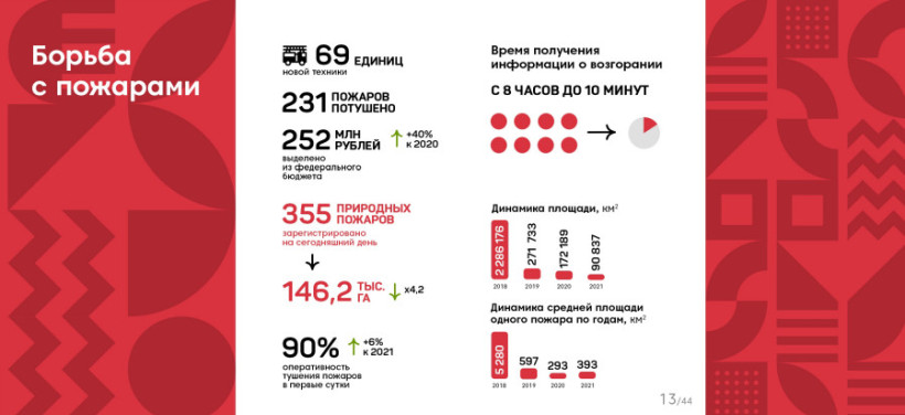 Тем не менее пожары остаются угрозой. На сегодняшний день у нас зарегистрировано 355 природных пожаров на площади 146 тысяч гектаров. Оперативность тушения пожаров в первые сутки составляет 90 процентов, что на 6 процентов выше уровня 2021 года.
