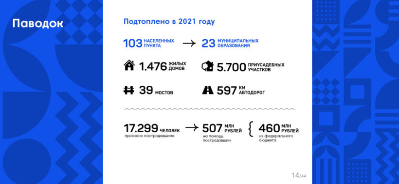 Также мы занимались обеспечением жильем людей, чьи дома были утрачены в результате паводка, предоставляли выплаты на капитальный ремонт. Признано пострадавшими  более 1 400 жилых помещений. На выплату компенсаций направлено 2 миллиарда рублей. Работа продолжается и в этом году.