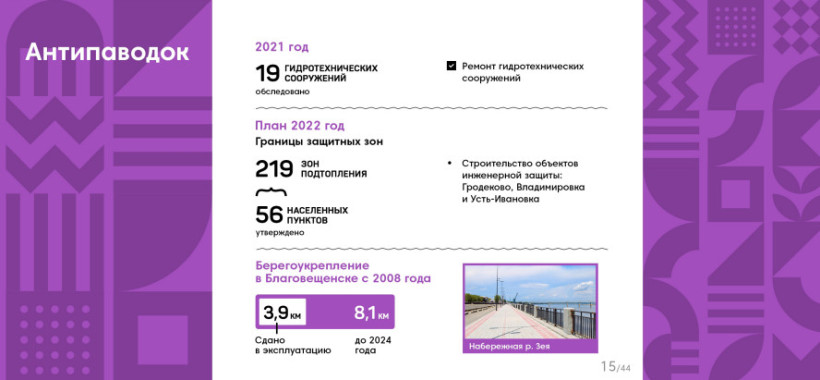 Продолжаем работать и над тем, чтобы паводки не могли застать нас врасплох и нанести серьезный ущерб жителям и экономике. В 2021 году проведено обследование 19  гидротехнических сооружений на действующих водохранилищах. В двух селах Тамбовского района сооружения капитально отремонтированы. Запланировано строительство объектов инженерной защиты от паводков и реконструкция сооружений в 9 наиболее пострадавших после наводнения 2013 года населенных пунктах. В трех из них при поддержке Минприроды России строительные работы начнутся в текущем году. Это Гродеково, Владимировка и Усть-Ивановка.