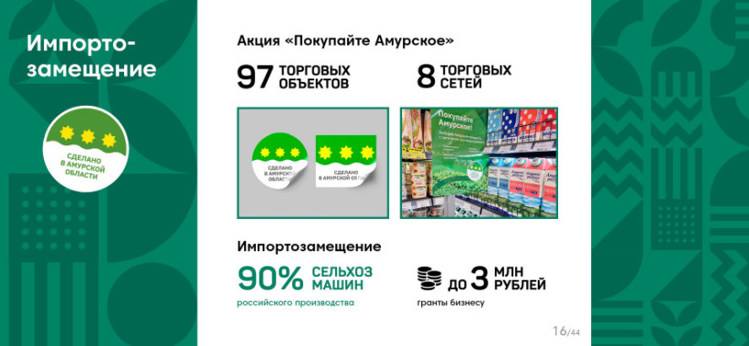 В продовольственной сфере для стабилизации цен мы запустили программу «Покупайте Амурское». С торговыми сетями и крупнейшими местными производителями договорились о заморозке цен по 42 позициям товаров. Это молочная и мясная продукция, яйца, крупы, овощи.