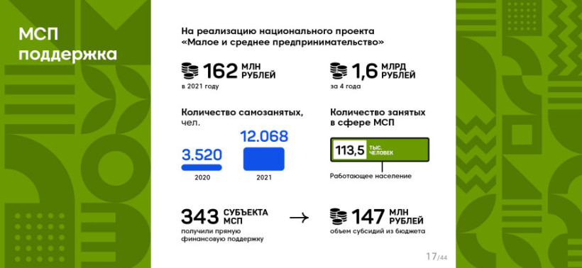 В 2021 были продолжены все меры поддержки, разработанные в 2020 году для того, чтобы облегчить жизнь предпринимателям в период пандемии. На реализацию национального проекта «Малое и среднее предпринимательство» (МСП) выделено более 162 миллионов рублей. А всего за 4 года на поддержку бизнеса в рамках региональной программы направлено 1,6 миллиарда рублей из федерального и областного бюджетов.
