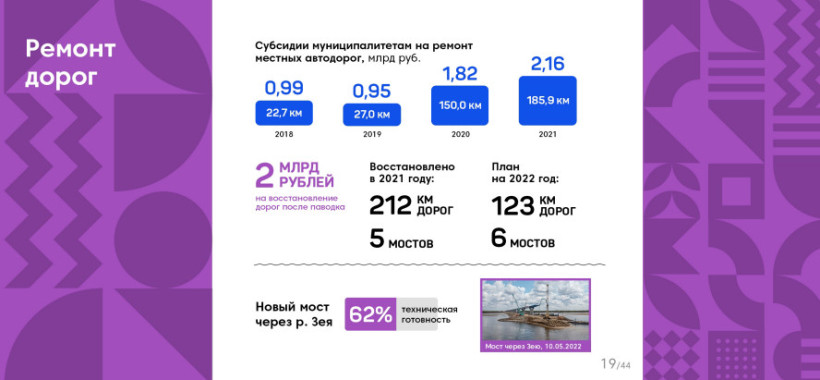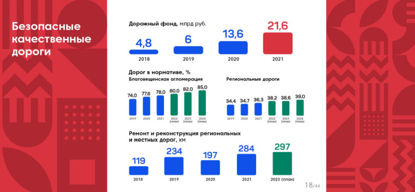 На национальный проект «Безопасные качественные дороги» направлено 3 миллиарда рублей. Половина средств — из федерального бюджета, они направлены на реконструкцию участка трассы Благовещенск — Свободный. В 2021 году шла работа по 28 объектам. Комплексно отремонтировано 83 км дорог.