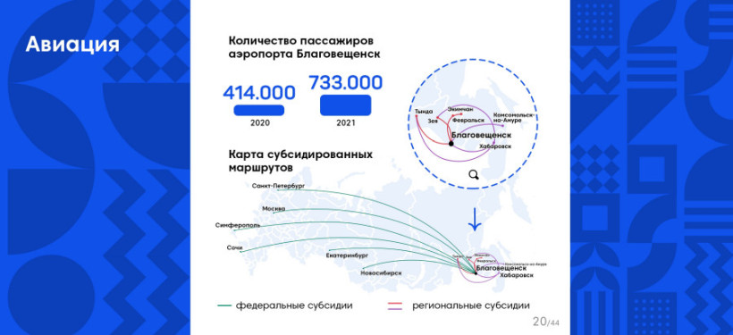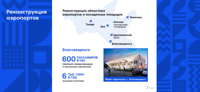 Продолжается реконструкция областных аэропортов и посадочных площадок. Это крайне значимая для нас тема. В рамках федеральной программы «Развитие транспортной системы» идет реконструкция аэропорта в Зее, которая закончится в текущем году. Завершена реконструкция посадочной площадки Бомнак. На этот год запланирована  реконструкция аэропорта Экимчан, а  с 2025 года — аэропорта Тында. Кроме того, по программе Роскосмоса строится аэропортовый комплекс в Циолковском, ВПП которого будет готова в этом году.