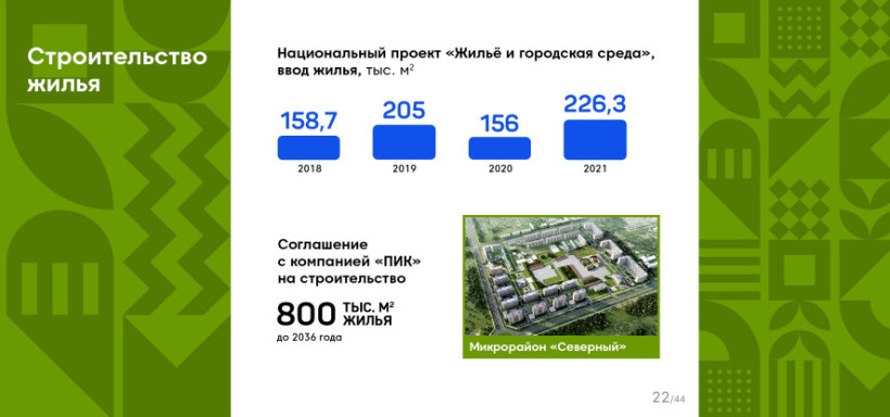 По национальному проекту «Жилье и городская среда» мы видим позитивную динамику в приросте ввода жилья с 2019 года. Финансирование в прошлом году составило 2,5 миллиарда рублей, из них 1,8 миллиарда федеральных средств. Показатели в 2020 году ниже — из-за пандемии, год был сложным, как для любой отрасли. Однако в прошлом году мы ввели в строй 226 тысяч кв. метров жилой площади. Задача, поставленная в нацпроекте, была выполнена. В этом году запланирован ввод еще 206 тыс. кв. метров. За 4 месяца построено 120 тыс. кв. м метров жилья —больше половины от годового плана.