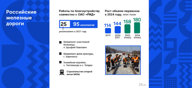 Большой объем работ по благоустройству запланирован совместно с «Российскими железными дорогами». В прошлом году мы заключили соглашение о сотрудничестве до 2024-го. Из 95-ти  мероприятий, предусмотренных соглашением, реализовано 33. В частности, проведен капитальный ремонт участковой больницы в поселке Ерофей Павлович и Дома культуры в Завитинске. В зоне БАМа за счет средств «РЖД» проведен капремонт школ и детских садов в Февральске, поселках Верхнезейск, Дипкун  и Юктали.
