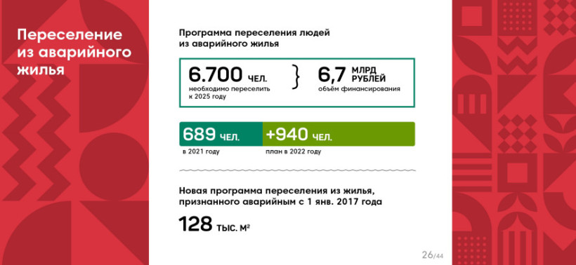 Кроме того, формируем новую программу переселения из жилья, признанного аварийным после 1 января 2017 года. Это еще 128 тыс. кв. м.