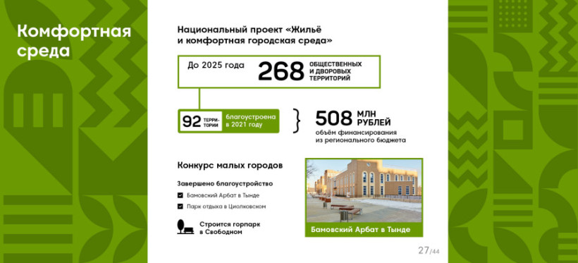 Преобразились Бамовский Арбат в Тынде и Парк отдыха в Циолковском. Эти проекты стали победителями Всероссийского конкурса лучших проектов создания комфортной городской среды. Еще один проект-победитель — благоустройство городского парка в Свободном. Здесь работы запланированы на 2022—2023 годы. Всего в прошлом году благоустроено 68 дворовых и 24 общественных территорий — на 30 больше, чем планировалось.