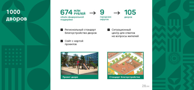 В этом году собираемся  благоустроить  105 дворовых территории. Объем федеральной поддержки составляет 674 миллиона рублей. Поддержку получат все наши девять городских округов. Каждый проект был создан при участии м