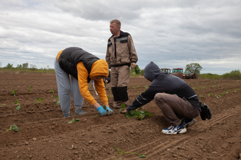 Вместе с отсортированной рассадой молодежь переезжает на поле, где уже идет высадка, — два человека опускают каждый саженец в специальное отверстие «сажалки», куда подается вода. Пройдя сквозь посадочную машину, растения оказываются в земле. Идущие следом проверяют, хорошо ли закрепился росток на грядке. Это финишная прямая посевной в хозяйстве Владимира Шилова — картофель уже занял свои 160 гектаров, посеяны свекла и морковь — вместе с капустой под них отдано порядка 50 гектаров. По словам фермера, он готов работать на площади в три раза больше — но свободных земель в Благовещенском районе не найти.