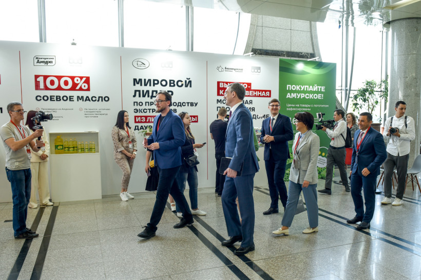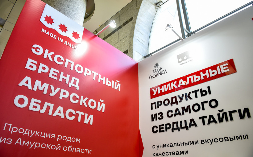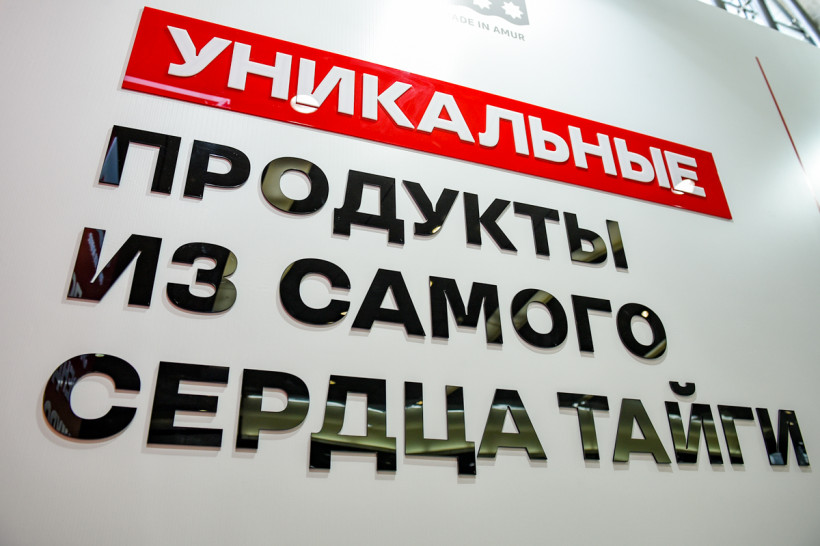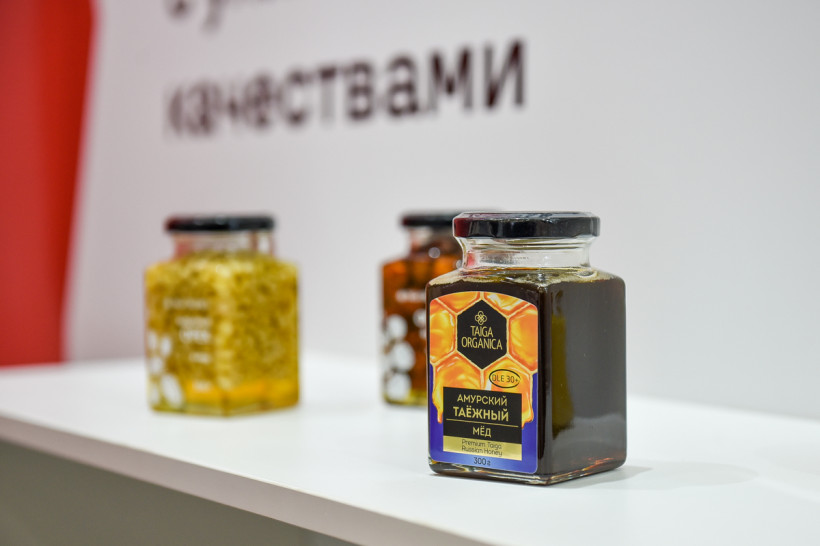Стройные ряды бутылок с соевым маслом «Амурская жемчужина», баночками меда, молочной продукцией и БАДами напоминает популярную часть ярмарки «продэкспо» — однако в этом году купить и попробовать продукт на АЭФ нельзя. Экспортный бренд области представляют самые узнаваемые товары родом из Приамурья. Такие как мед, который прославил Владимир Путин, купив для китайского лидера во время Восточного экономического форума. «Тайга Органика» уже развивает франшизу.