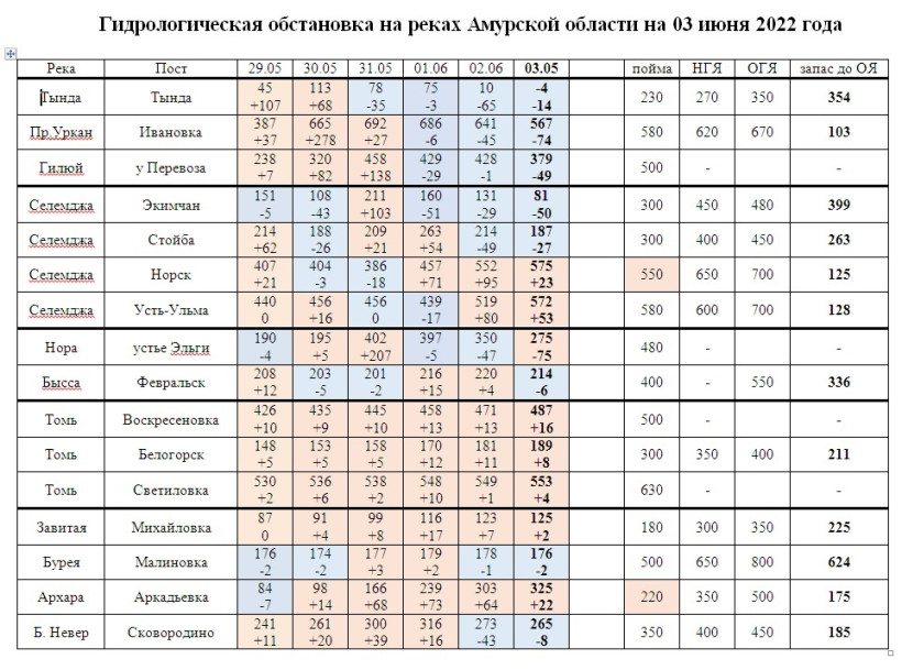 Согласно гидрологии на 3 июня, подросли уровни Селемджи и Томи, прибывает почти по всему течению основные реки Амур и Зея.