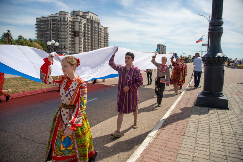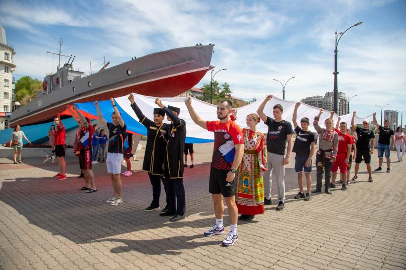 Флаг России размером 9 на 6 метров развернули на набережной столицы Приамурья 12 июня — в Благовещенске прошла патриотическая эстафета «Флаг моего государства». В ней приняли участие волонтеры, представители разных национально-культурных объединений, спортсмены и курсанты ДВОКУ.