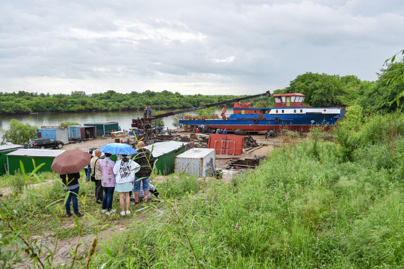 Спустя полчаса оказываемся в пункте назначения. Генеральный директор компании «Торговый знак «Благоверфь» Сергей Жеребцов радушно встречает журналистов и предлагает спуститься ближе к воде на его автомобиле. Вот когда начинаешь сожалеть, что на всякий случай не припрятал где-то в редакционном шкафу резиновые сапоги.