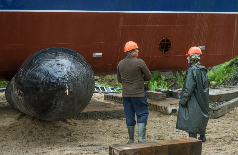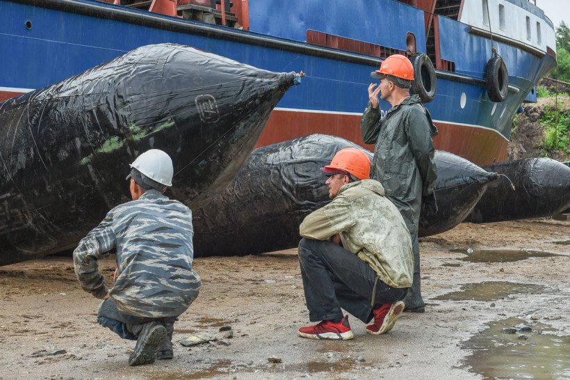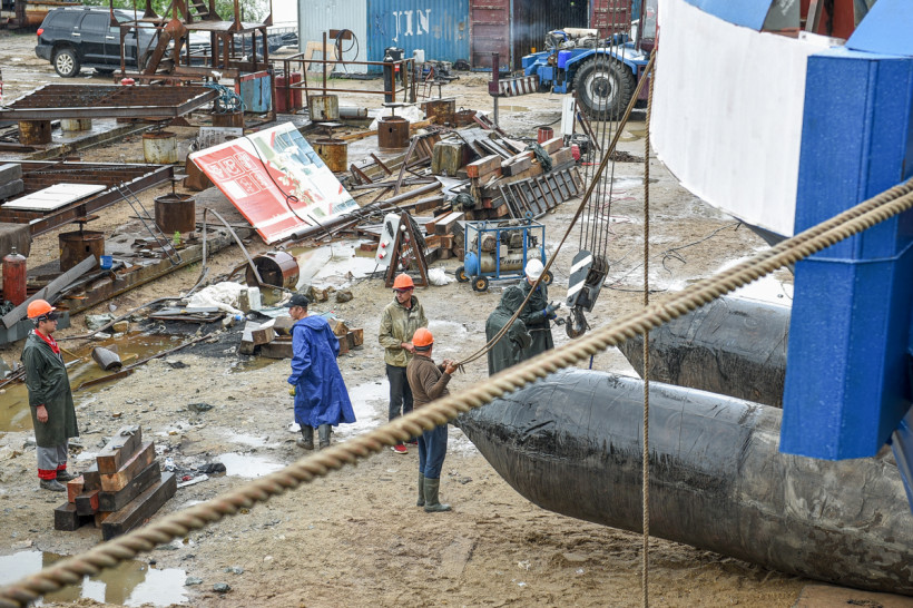 Лишь после росчерков пера можно начинать непосредственную подготовку площадки. Здесь, кстати, тоже всё должно быть по нормативам, в том числе и угол наклона берега. Затем сюда завозятся ролик-мешки для спуска, пригоняется маневренный кран и бульдозер, подготавливается к работе полиспаст (устройство в виде массивного металлического крюка на нескольких тросах, которое помогает поднять любой груз). В этом случае его применяют для подтягивания судна и перемещения подушек во время его движения к воде.