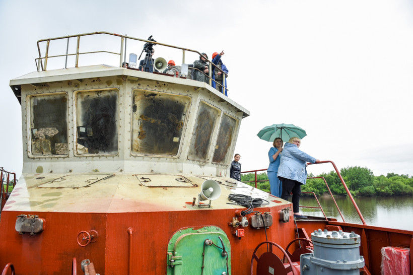 Подходим ближе и видим, как возле железного сооружения суетятся люди в синих и черных дождевых плащах. «Наверняка рабочие», — подумалось сразу. Мужчины в касках, дождевиках и высоких сапогах ходят вдоль борта от носа к корме, проверяя, все ли верно сделали. В 2022 году на воду спустили уже три судна, одно из которых — брат-близнец того, ради которого все здесь и собрались. Оба построены по заказу федерального казенного учреждения «Речводпуть».