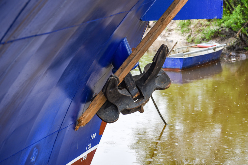 На специально оборудованной площадке заранее разложили ролик-мешки для спуска. Эти огромные черные надувные подушки нужны для плавного перекатывания теплохода с берега на поверхность воды. На них и водрузили главного виновника торжества: 37-метровое 80-тонное обстановочное судно проекта 3052. Такие теплоходы созданы, чтобы, как говорят специалисты, «осуществлять обстановку на реке» — то есть расставлять буи и знаки судового хода по типу дорожных.
