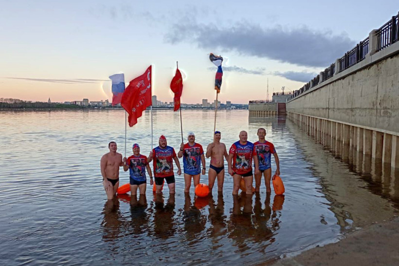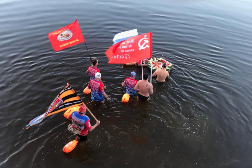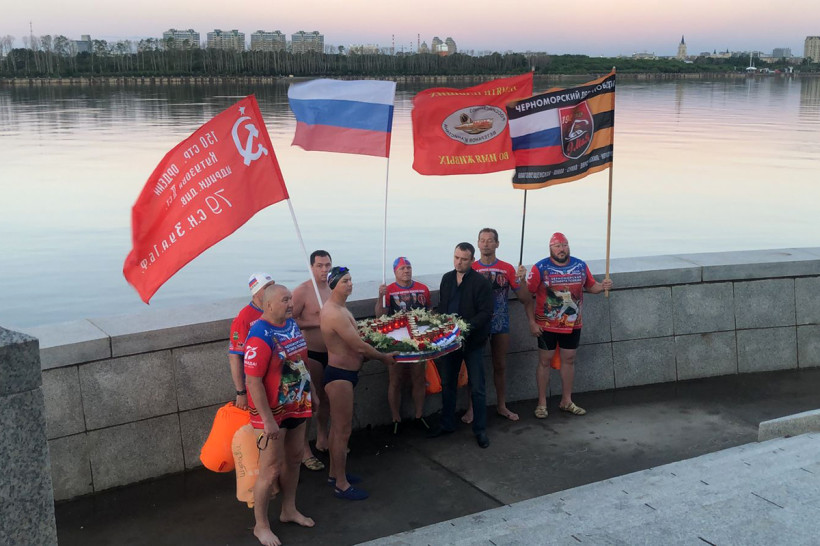 В среду, 22 июня, в амурской столице прошел заплыв «Свеча на воду», посвященный Дню памяти и скорби. Семеро амурчан проплыли по пограничной реке от бронекатера до флагштока, держа в руках флаги и копию Знамени Победы. По реке пловцы запустили плот из ветвей ели и гвоздик, обрамленный лентами триколора. На композицию в виде буквы Z установили 22 свечи.