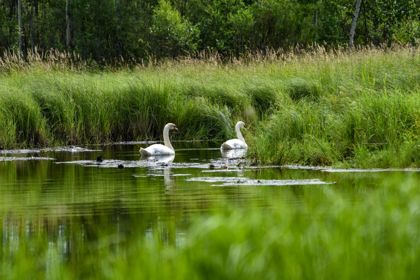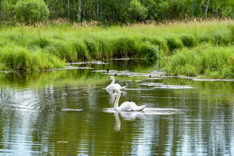 Недалеко от районной больницы уютная, почти не тронутая человеком зона — с заросшего травой берега видно, как по водной глади рассекают крылом к крылу Петр и Феврония. Более смелый самец «ведет», а его верная подруга следует за главой семьи.