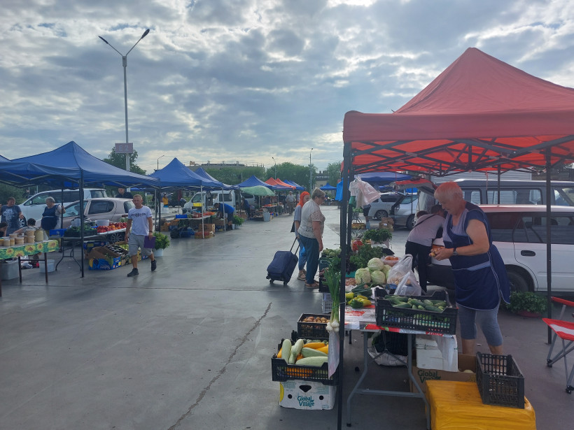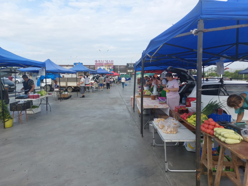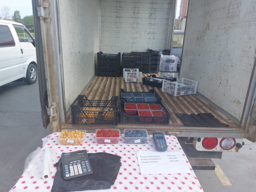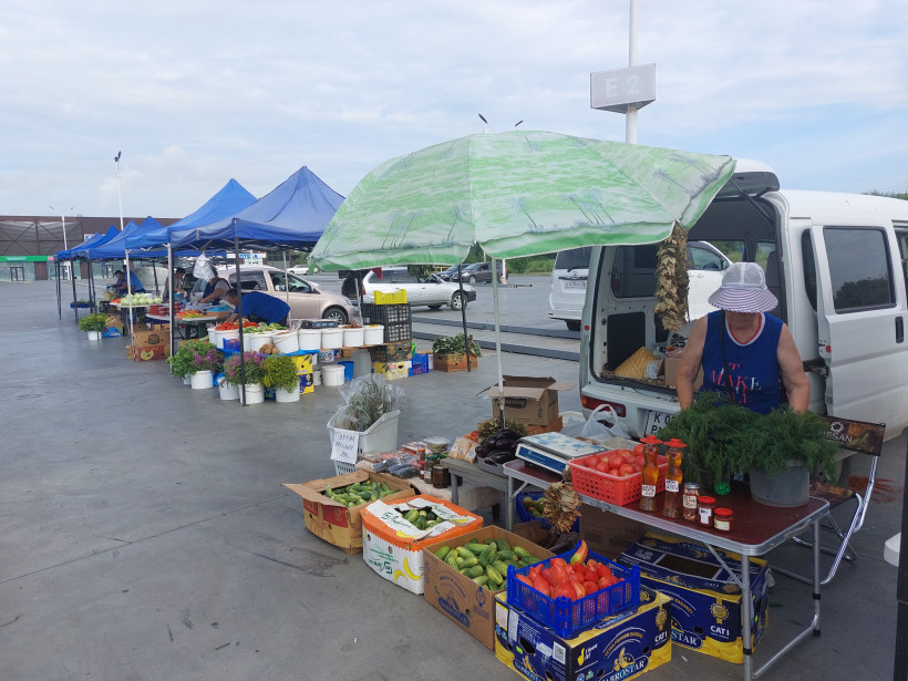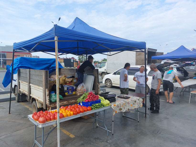 Еще до 8 утра многие палатки и машины оказались готовы к торговли: фермеры и дачники разложили свежий урожай, яркие овощи, тару с разноцветной ягодой, выстроили мешки с картофелем и бахчей. Пока на пустующие места подъезжают новые участники, где-то уже идет торговля. В рядах осматривает ассортимент супружеская пара, а также девушка с чемоданом.