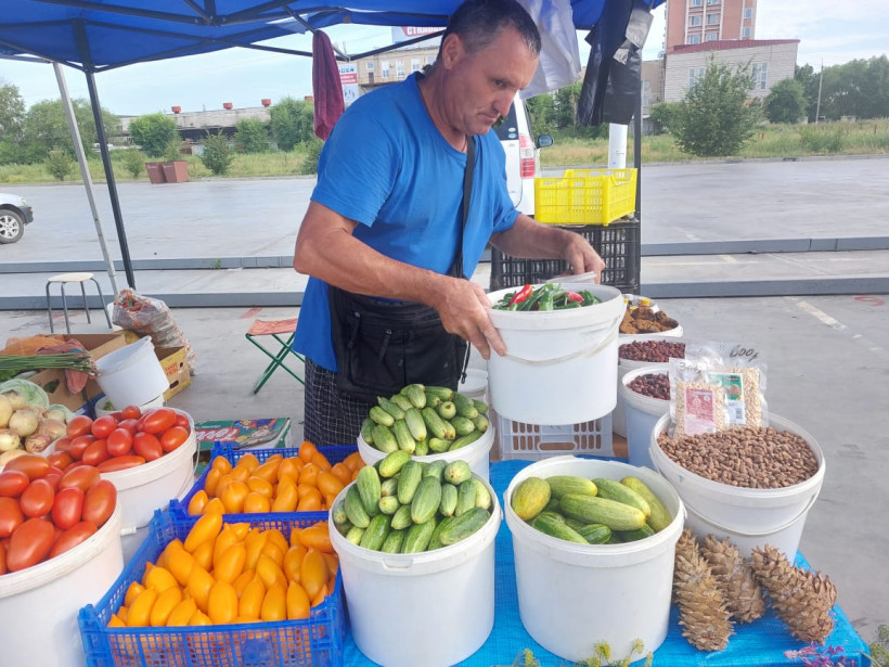 На ярмарке выходного дня можно купить кабачки, баклажаны, томаты, зелень, ягоду, соленья, а также цветы, банные веники, кедровые орешки и даже сосновые шишки, из которых варят варенье.