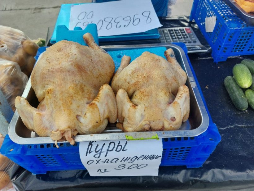 Среди привычной огородной продукции интригующе выглядят тушки охлажденных кур — немного опаленные, поэтому я, городской житель, не сразу поняла, что это не готовый к употреблению продукт. Деревенские братья знаменитых бройлеров — по 300 рублей за кило.