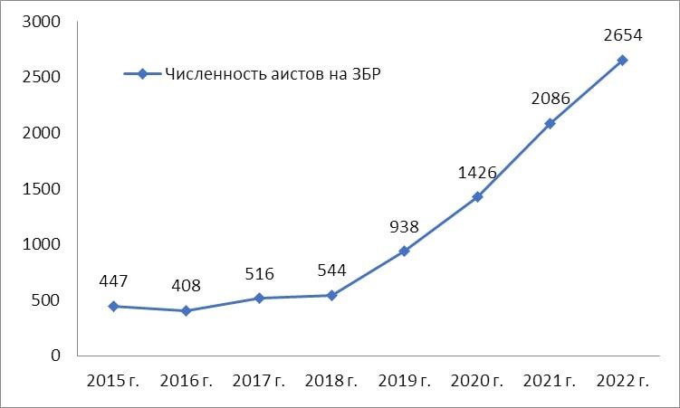 В 2022 году Антон Сасин насчитал на обследуемой местности 564 жилых гнезда, а численность птиц составила 2 654. Гнездятся аисты в основном на деревьях, но растет число гнезд и на ЛЭП. И в этом году впервые удалось отметить датчиками родившихся в таких гнездах аистят. В целом популяция продолжает активно расти, отмечает орнитолог.