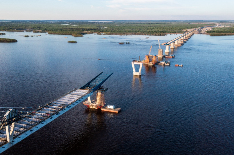 Первый этап надвижки левобережной части пролетного строения начался в апреле прошлого года. Его смонтировали на 16 опорах (с 26 по 11) чуть больше чем за год. Всего на этом участке было проведено восемь этапов. Протяженность конструкции составила 86 метров. В ходе работ пролетное строение весом 4 842 тонны и длиной 1 301 метр было смонтировано на 11-й опоре строящегося сооружения.