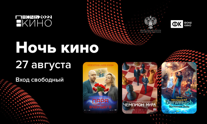 Откроет кинопоказ картина для семейного просмотра «Последний богатырь: Посланник Тьмы» (6+) режиссера Дмитрия Дьяченко. Вторым в программе станет семейный фильм «Пара из будущего» (12+) режиссера Алексея Нужного, его покажут в 21:50. Стойких полуночников ждет просмотр фильма Алексея Сидорова «Чемпион мира» (6+). Это картина о самом драматичном и легендарном поединке в истории шахмат между действующим чемпионом мира Анатолием Карповым и гроссмейстером Виктором Корчным, эмигрировавшим из СССР. Показ картины начнется в 23:45. Вход на все фильмы свободный.