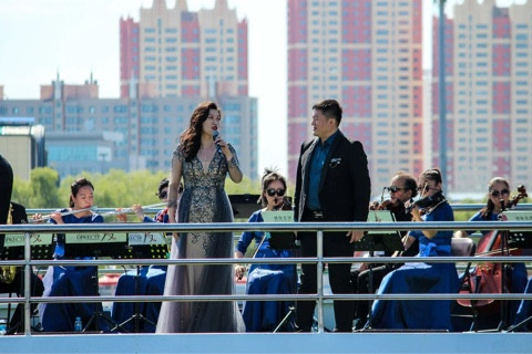 На середине реки встретились российский и китайский теплоходы: пограничный концерт устроил сводный международный оркестр Благовещенска и Хэйхэ. С российской стороны оркестром руководил заслуженный работник культуры Амурской области, дирижер оркестра «Amur Jazz Band» Анатолий Хопатько, с китайской — замруководителя Народного театра искусств Хэйхэ, дирижер международного оркестра Китая Во Бинкунь.
