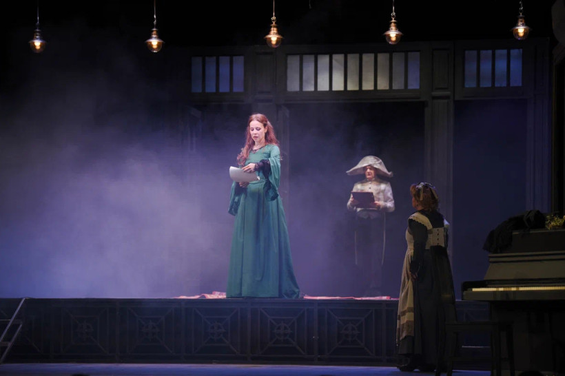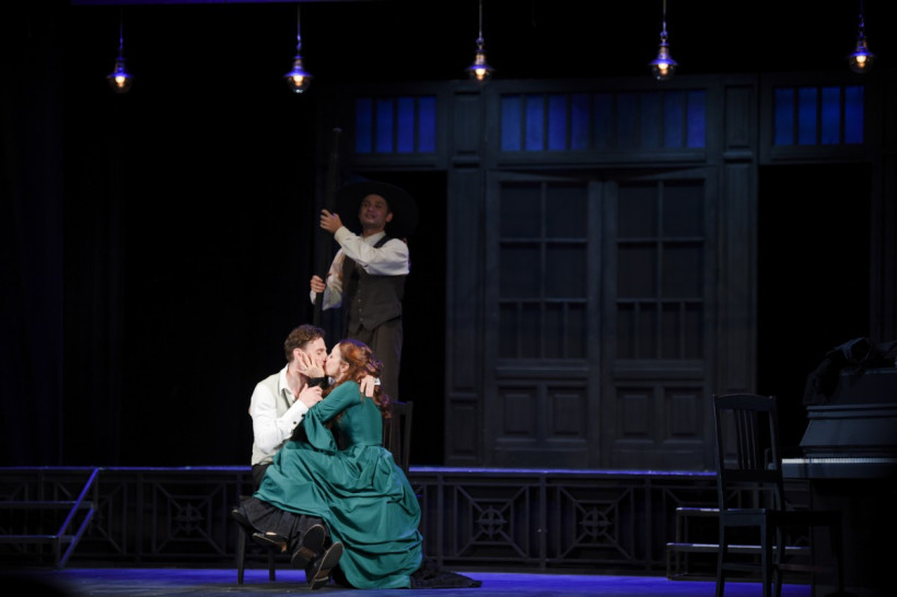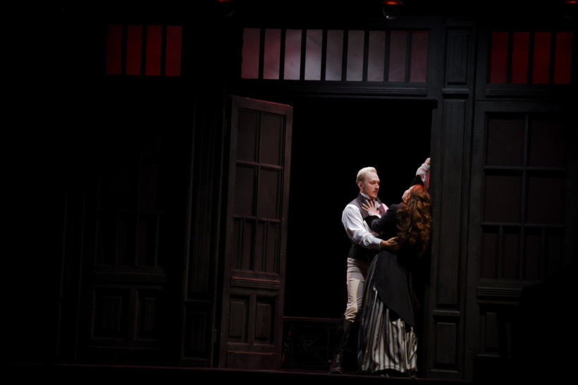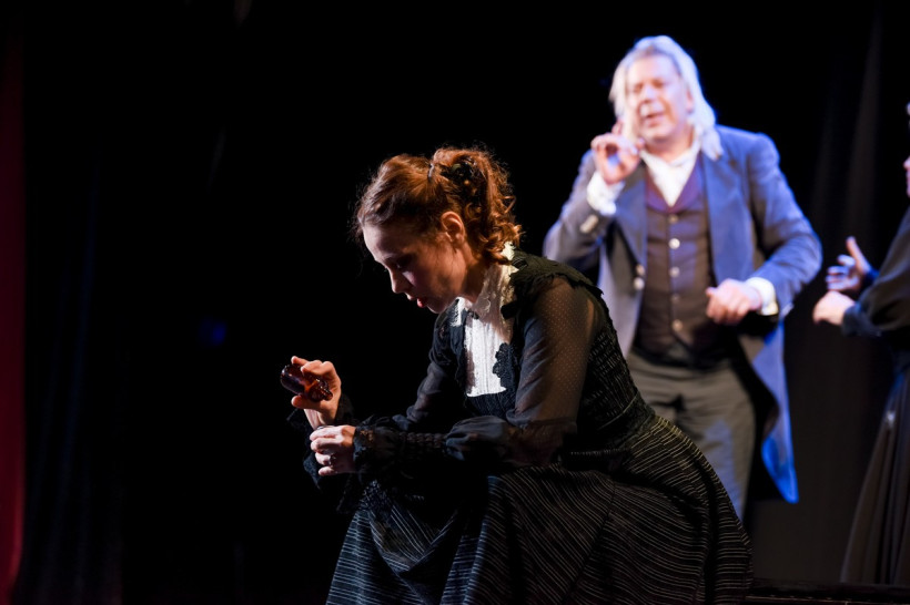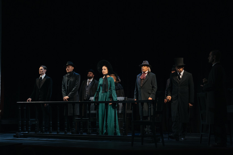 С судебного процесса над романом и начинается спектакль «Бовари» Государственного академического театра имени Евгения Вахтангова. Режиссер спектакля Ольга Субботина сразу же представляет всех, кто выйдет на черную сцену в этот вечер, в первой же мизансцене давая характеристику персонажам одним их только появлением. Главная героиня Эмма (актриса Анна Дубровская) — единственная, кто имеет хоть какой-то цвет в этом черном кабинете и серых декорациях, среди черных и серых фигур ее окружения. Ее костюмы — то светлый девичий наряд, то шелковисто-серый костюм молодой дамы, то страстно-зеленое платье — кричат, что вот она: главная, яркая, сверкающий страз на полотне покрывала провинциальной регламентированной жизни.