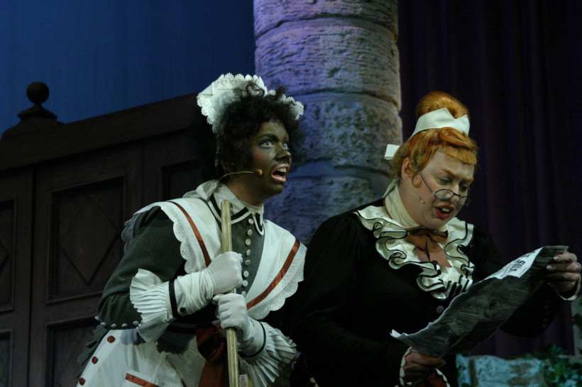 Широкому зрителю оперетта Эрве хорошо известна по знаменитому фильму «Небесные ласточки» с участием Ии Нинидзе, Людмилы Гурченко, Андрея Миронова, Александра Ширвиндта. В театральной, вахтанговской версии режиссер Владимир Иванов пошел другим путем и представил спектакль в трех действиях как оперетту, в которой кроме музыкальных и танцевальных номеров, незамысловатого текста мелькают шутки-импровизации на злобу дня. А чего только стоят смешные костюмы, нелепые парики, выразительный грим и найденные для каждого персонажа несложные, но яркие внешние характеристики!