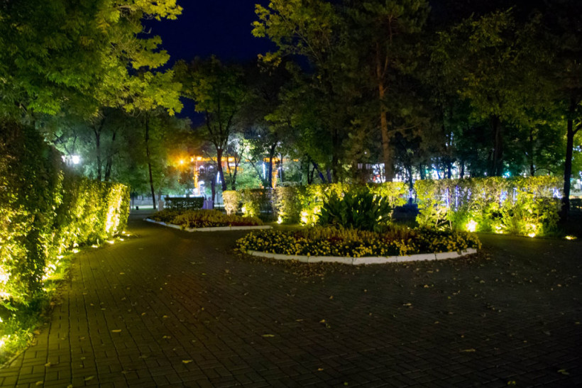 В сквере Центра эстетического воспитания им. В.В. Белоглазова в Благовещенске снова засветились вальсирующие пары. Подрядчик завершил электромонтажные работы. Теперь территория зеленой зоны подсвечена желтым и голубым цветами.