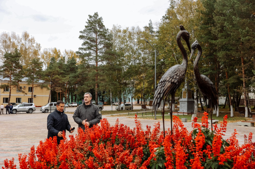 Василий Александрович посетил центральную площадь села в сопровождении главы Ромненского округа Анатолия Опаленко. Масштабный ремонт здесь начался ещё в 2021 году. На её реконструкцию из местного бюджета было направлено порядка 30 миллионов рублей. Главным объектом площади стала скульптурная композиция «Журавли». Два японских журавля — символы района, как и на флаге, теперь стоят на площади.