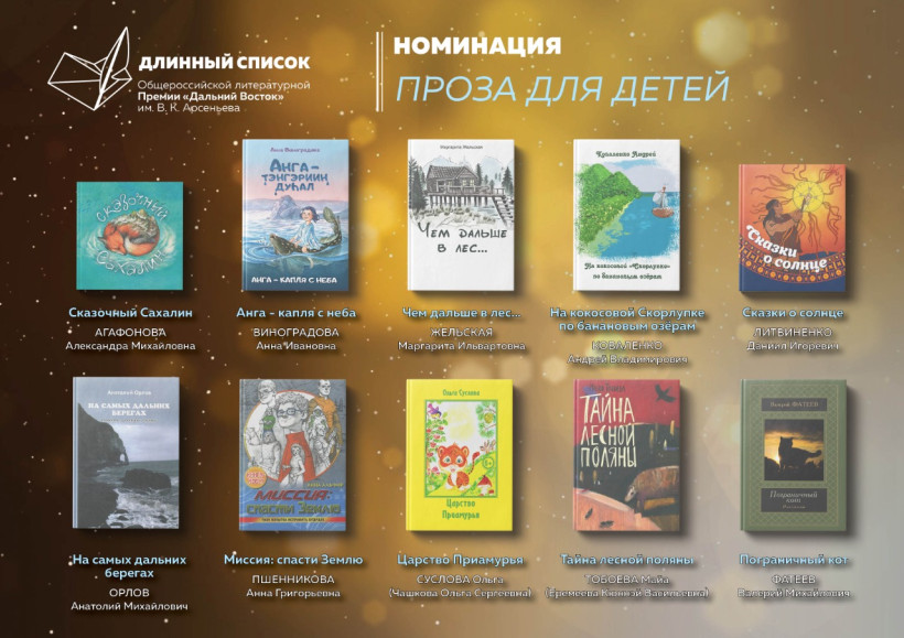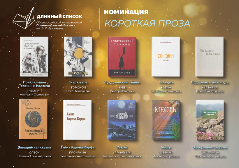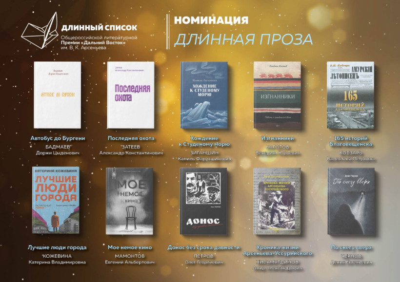 В нём 30 произведений в трех номинациях – «Длинная проза», «Короткая проза» и «Проза для детей»Длинный список премии Арсеньева объявили в Хабаровске. В лонг-лист вошли 30 произведений в трех номинациях – «Длинная проза», «Короткая проза» и «Проза для детей». Список обнародовал куратор общероссийской литературной премии «Дальний Восток» имени В. К. Арсеньева, директор журнала «Юность» Вячеслав Коновалов.