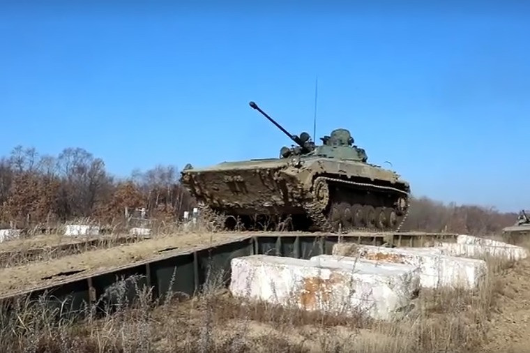 Мобилизованные военнослужащие мотострелковых подразделений ВВО учатся водить БМП-2 на полигоне в Екатеринославке. Они преодолевает естественные и искусственные препятствия — колейный мост, противотанковый ров и участок маневрирования.