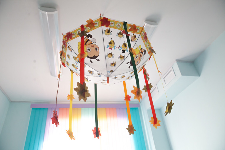 В больших помещениях очень солнечно и уютно. В глаза бросаются широкий коридор и высокие потолки. Тепла добавляют и сочные краски, а также рисунки на стенах. Они есть и в коридорах, и в самих группах.