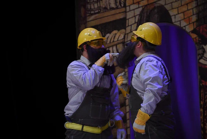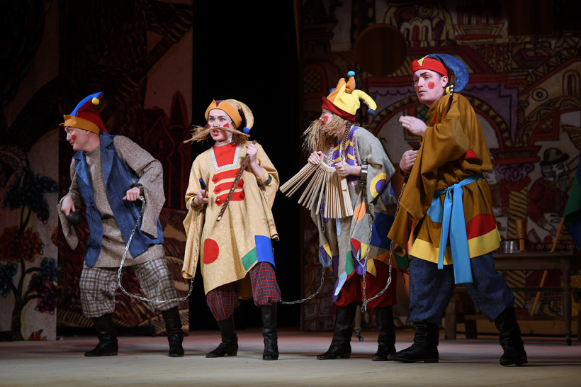 Отдельно хочется отметить работу коллектива скоморохов. Они — голос автора, тот самый кордебалет, который создает историю не меньше, чем главные действующие лица. Оставаясь в шутовских колпаках, с усами и бородами из мочалки, молодые актеры перевоплощались то в оппозицию в цепях, по в вышколенную охрану, прислугу, то классно хулиганили в образе ведущего дебатов или радиодиджея.