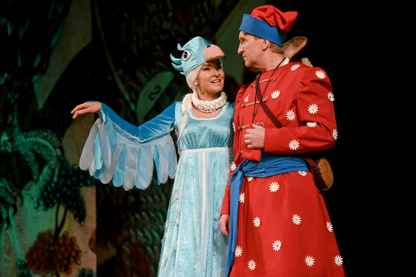 Так Тит Кузмич и Фрол Фомич — волшебные помощники Маруси — вылитые миньоны из «Гадкого Я». Баба-яга «ожигает» под хит Киркорова, напоминая одновременно нескольких поп-звезд. Жизнь царской семьи (Царя и Царевны) постоянно в объективе фотокамеры, а красный телефон-автомат на сцене вообще воспринимается как еще один персонаж.
