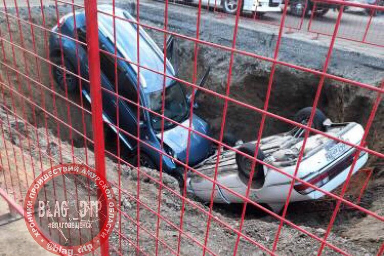 Две иномарки в Благовещенске утром 9 ноября попали в перекоп на Октябрьской — 50-летия Октября. Машины слетели в вырытую и огороженную забором яму с разницей чуть больше часа.