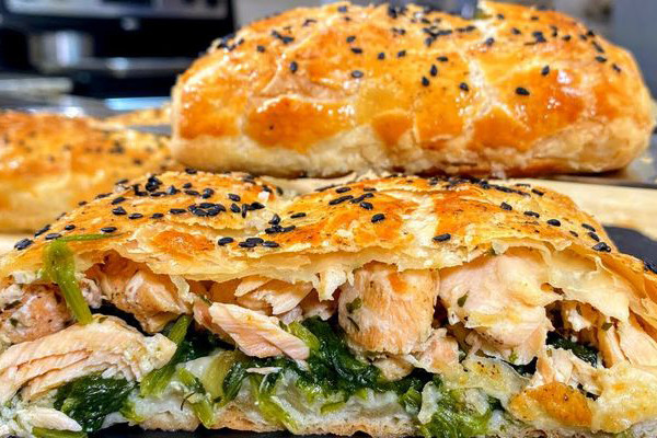 Сочетание красной рыбы и шпината — всегда беспроигрышное. Пирог готовится просто и быстро. Сверху — хрустящее слоеное тесто, внутри — сочная рыбная начинка.