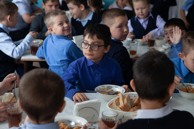 ребенка получают горячее питание в школе села Грибское