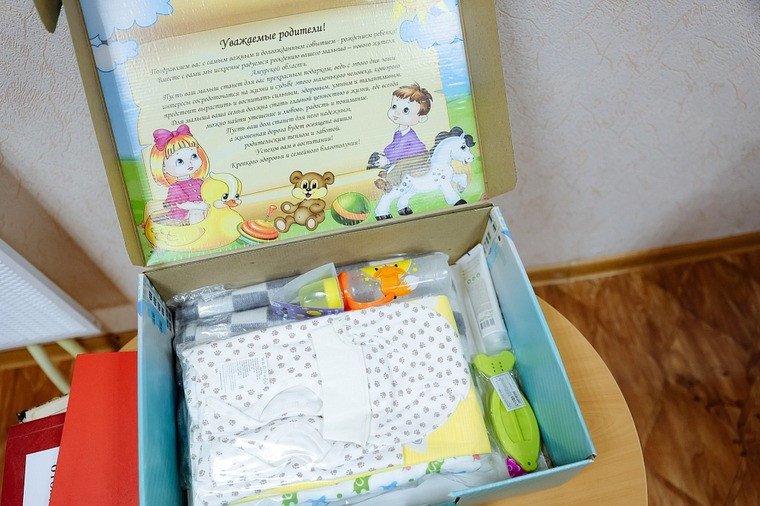 Сейчас в комплект входят боди с длинным и коротким рукавом, шапочка, чепчик, штанишки, одеяло, две пеленки, крем от опрелостей, термометр для воды без ртути, погремушка и бутылочка для кормления.
