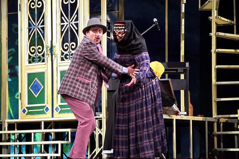 Тут, наверное, стоит сказать, что на амурских подмостках «Ханума» волею режиссера превратилась из грузинской комедии XIX века в шутливую праздничную программу с тамадой и конкурсами в национальном духе. Сваха Ханума не только решает сердечные и финансовые проблемы действующих лиц, но и проводит интерактив со зрителями, поет в микрофон (кажется, на грузинском) и даже фотосессию устраивает по ходу дела.