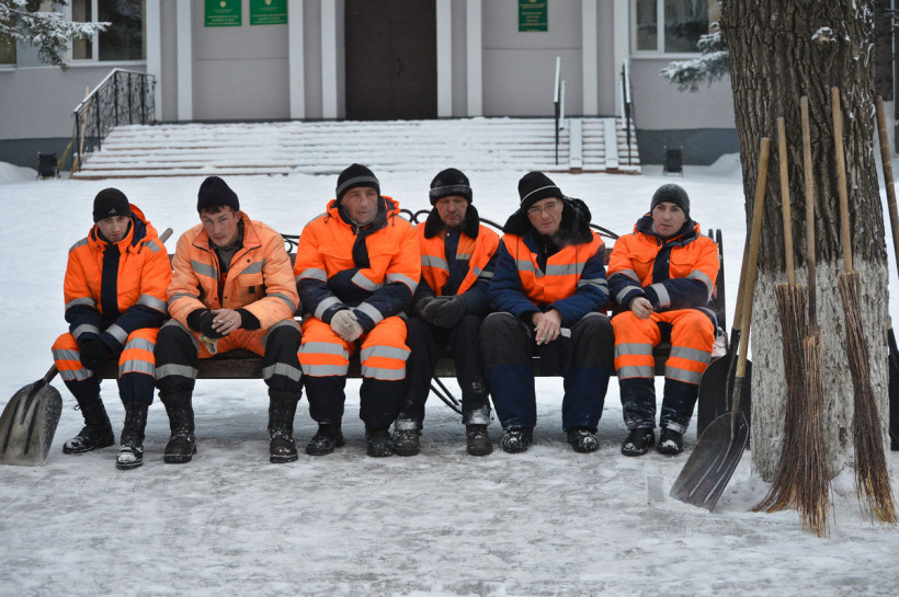 В смену на улицы города выходят до 50 рабочих (с привлеченными волонтерами). Треть отправляют грузить лопатами сметенный к обочинам снег в грузовики. Остальные делятся на два звена. В первую очередь работают на остановках. «Всего в городе около 400 остановок. Одна бригада за день очищает от снега четыре: две до обеда и две после».