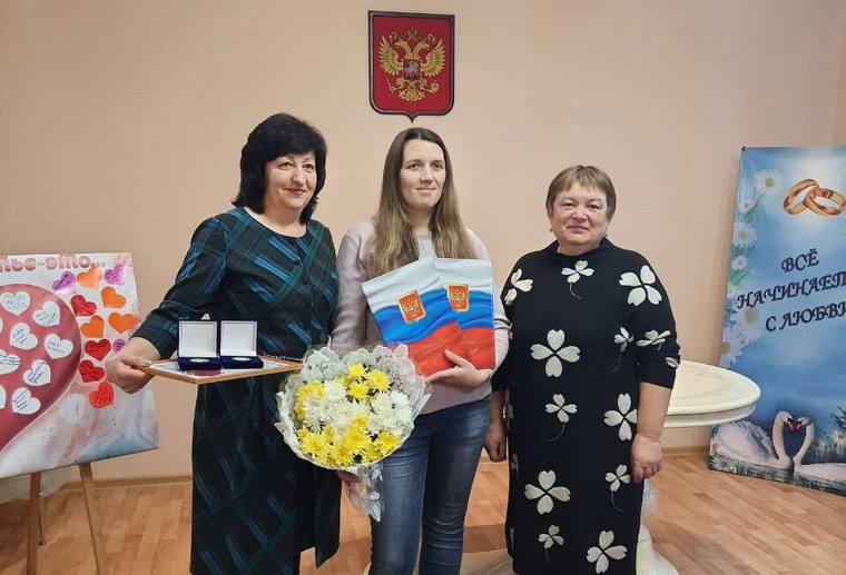Руководитель отделения ЗАГС Ирина Декало передала главные документы детей — свидельства о рождении и памятные знаки «Рожденному в Приамурье».