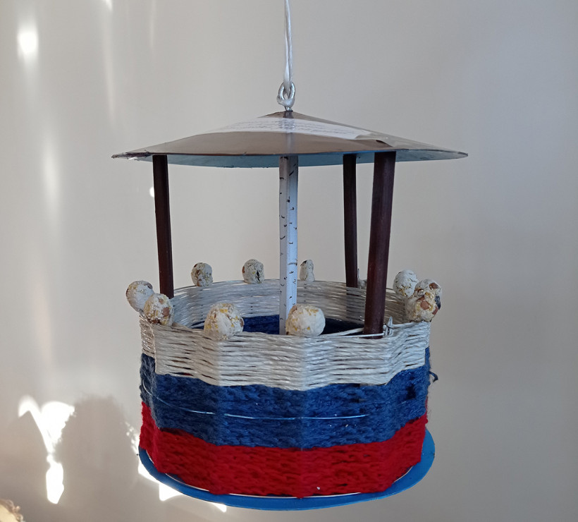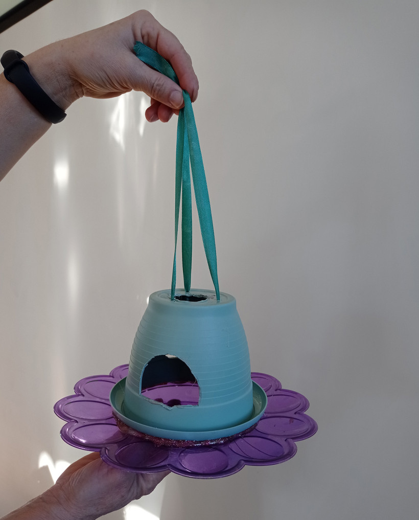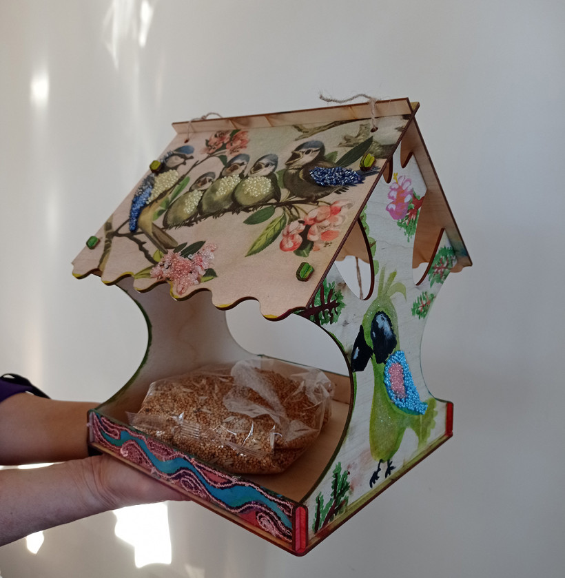 Кормушка была бы подходящей, но авторы перестарались: украсили ее искусственными материалами, бусинами и декоративными элементами из пластика. Если птица по ошибке склюет их, итог будет печален.