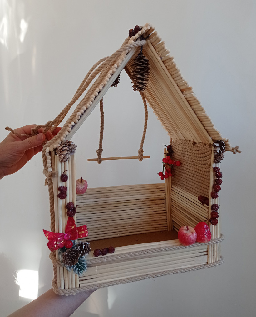 «Пряничный домик» на птичий лад: стены и крыша съедобны. Когда птицы склюют зерна и семена, эту кормушку можно использовать как обычную.