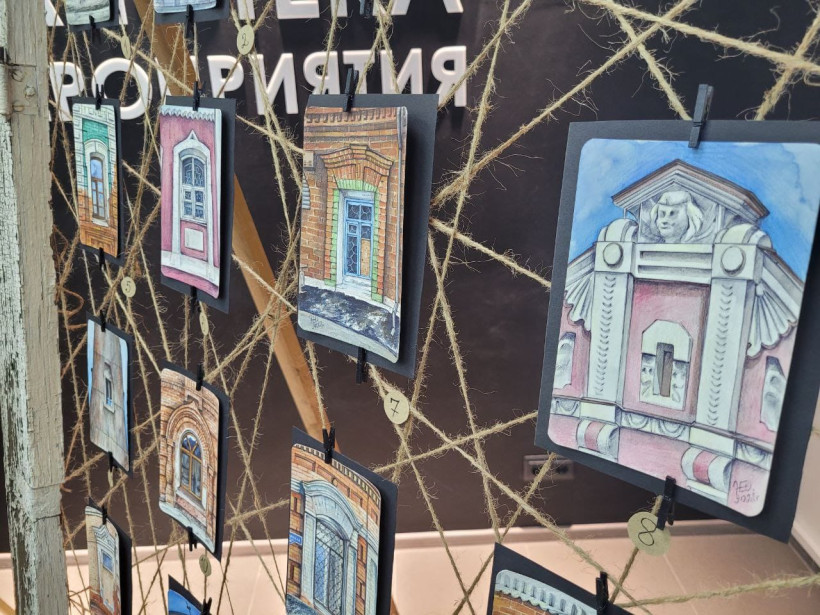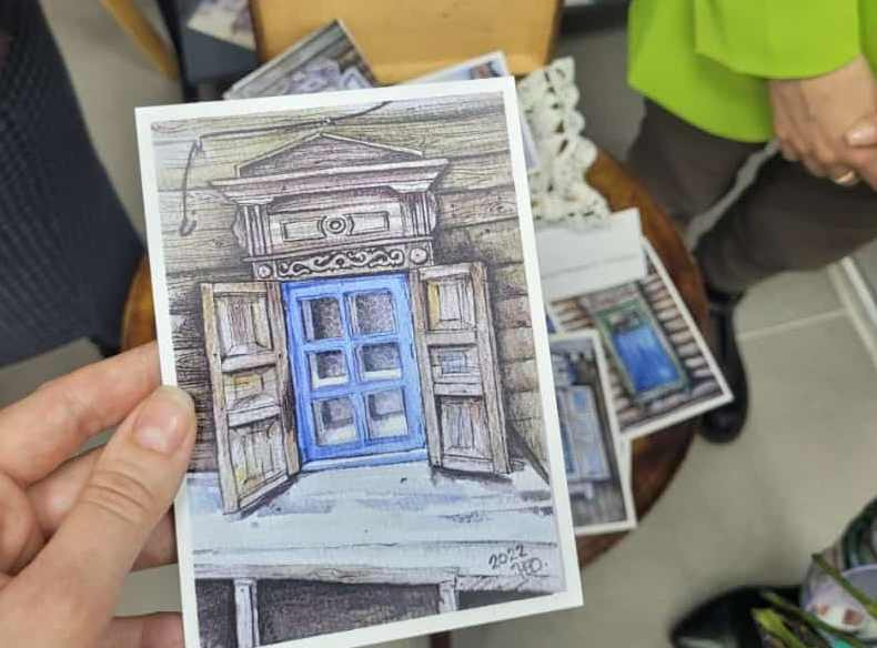 На открытках изображены окна исторических зданий Благовещенска. Все работы собраны на большой оконной раме, которую художнице предоставил для выставки другой почитатель старины Александр Лещенко.