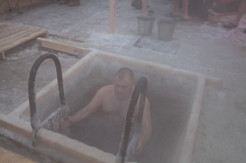 — Мама, фотай, как от меня идет пар! — кричит отважный мальчуган после окунания. Похоже, что ему не холодно, а очень даже весело.